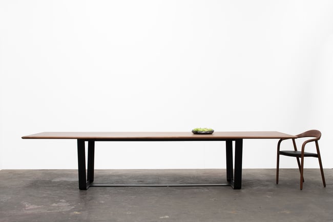 The Tyson is a large dining table with soft lines and a shaped solid timber edge detail. The steel base is finished in a textured matte black powder coat. We only use FSC certified timber and hand finish our dining tables in Osmo oil. This oil can be reapplied by the client when required. This table can also be made in a variety of timbers and in various sizes starting at 3000mm long. Pictured here is the Tyson table in American walnut.