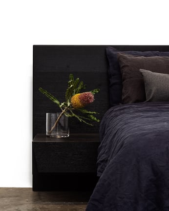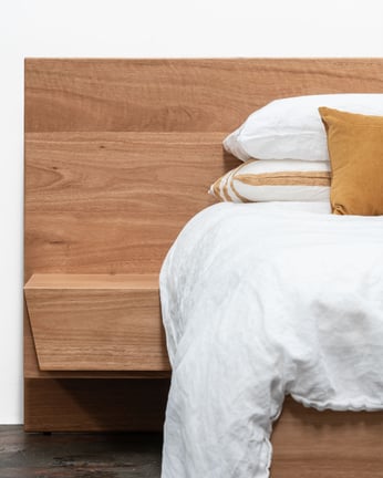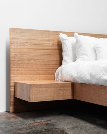FLOATING BED WITH CLIPPED WING DRAWERS IN TASMANIAN BLACKWOOD