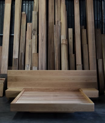 FLOATING BED WITH CLIPPED WING DRAWERS IN BLACKBUTT