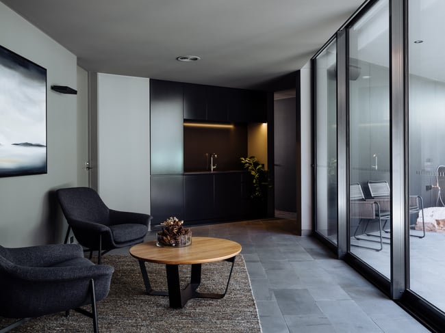 The Blackbutt coffee table has a laser cut steel frame with textured matte black powder coat. The solid Blackbutt top is oiled with Osmo. Shown here in a custom height for Jaws Architects. The solid Tasmanian Blackwood top is oiled with Osmo. Custom diameter and height by request.
