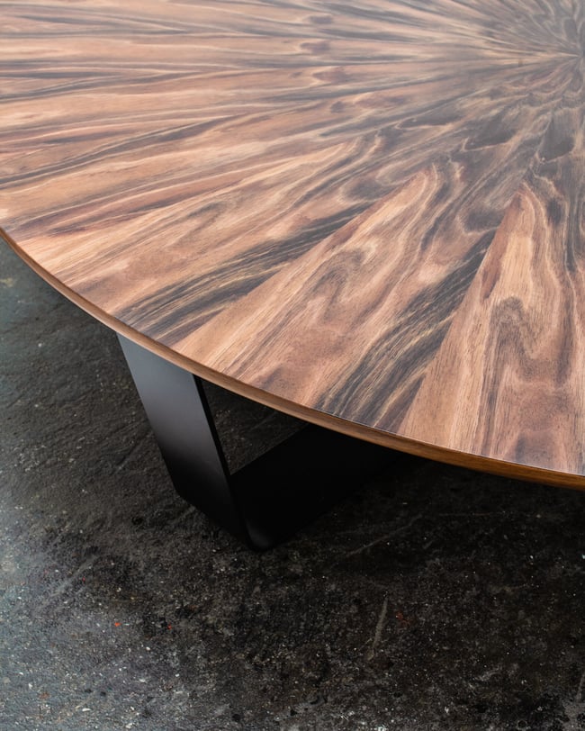 The sunburst coffee table has a timber veneer top and a laser cut steel frame finished in a textured matte black powder coat. Our sunburst coffee tables are finished in 2 pack and can also be made with a solid timber base.